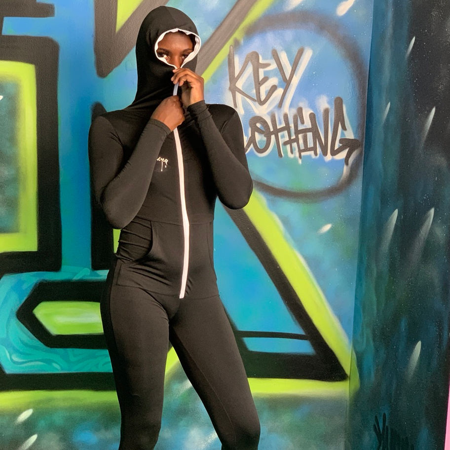 Introducing our Key Bape Jumpsuit, a must-have addition to your wardrobe. This black jumpsuit comes with a white zipper that runs all the way up to the top of the unique hood, making it a head-turner. The jumpsuit is very stretchy, ensuring maximum comfort throughout the day. It also comes with pockets, making it both stylish and practical. Designed with tall women in mind, this jumpsuit is perfect for anyone looking for a chic and comfortable outfit. Our model is 5'9 and is wearing a size small.